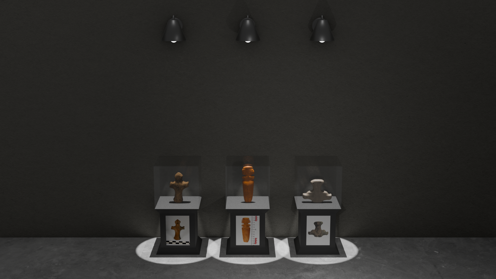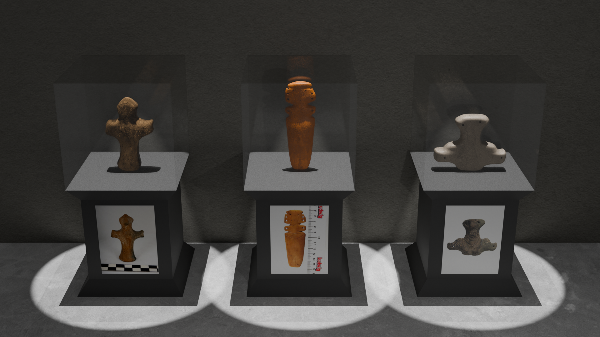 The three anthropomorphic figures, dating from 4500–4200 BC, are presented in a context resembling a museum exhibition. They are replicas of authentic figures from the Regional Historical Museum – Ruse. The first and third figures are modeled from a cube, while the second is modeled from a UV sphere. The tools used include Extrude, Scale, Move Tool, Inset, Loop Cut, Knife Tool, and Bevel, as well as Fill and Bridge Edge Loops for filling and connecting geometry.